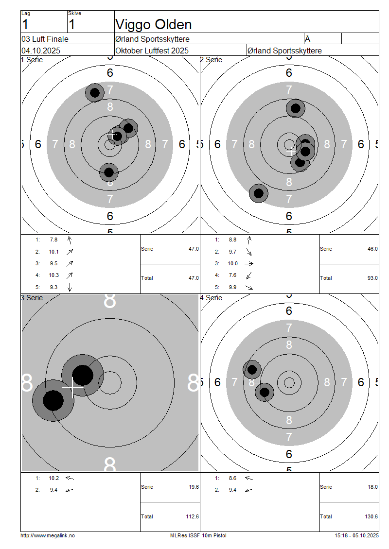| A | 3 | OLDEN Viggo | Ørland Sportsskyttere | Å | 47.0 | 46.0 | 19.6 | 18.0 | 130.6 | SO | |||||||||||||||||||||||||||||||||||||||