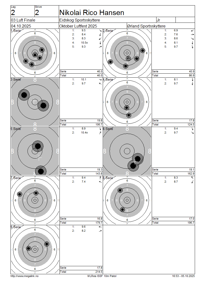 | B | 61 | HANSEN Nikolai Rico | Eidskog Sportsskyttere | Jr | 46.0 | 40.9 | 19.8 | 17.8 | 19.3 | 19.1 | 16.8 | 17.0 | 17.8 | 214.5 | SO | ||||||||||||||||||||||||||||||||||