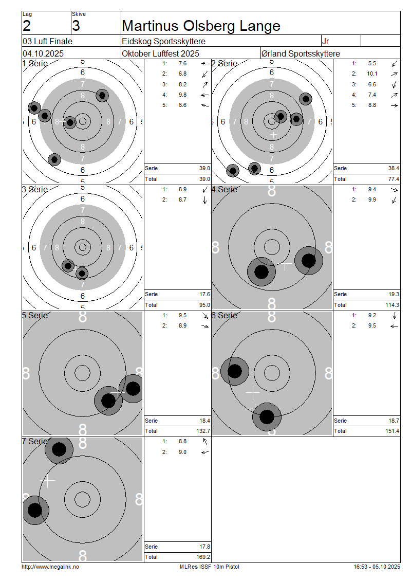 | C | 7 | LANGE Martinus Olsberg | Eidskog Sportsskyttere | Jr | 39.0 | 38.4 | 17.6 | 19.3 | 18.4 | 18.7 | 17.8 | 169.2 | SO | ||||||||||||||||||||||||||||||||||||
