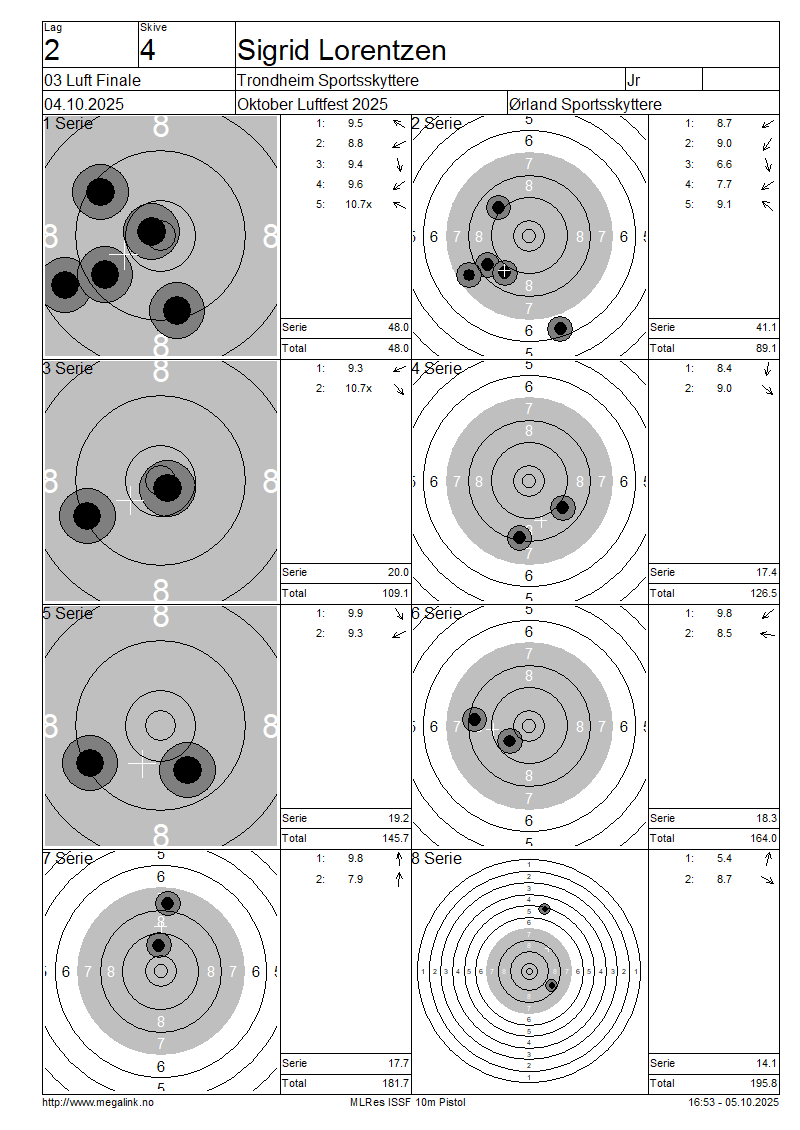 | D | 29 | LORENTZEN Sigrid | Trondheim Sportsskyttere | Jr | 48.0 | 41.1 | 20.0 | 17.4 | 19.2 | 18.3 | 17.7 | 14.1 | 195.8 | SO | |||||||||||||||||||||||||||||||||||