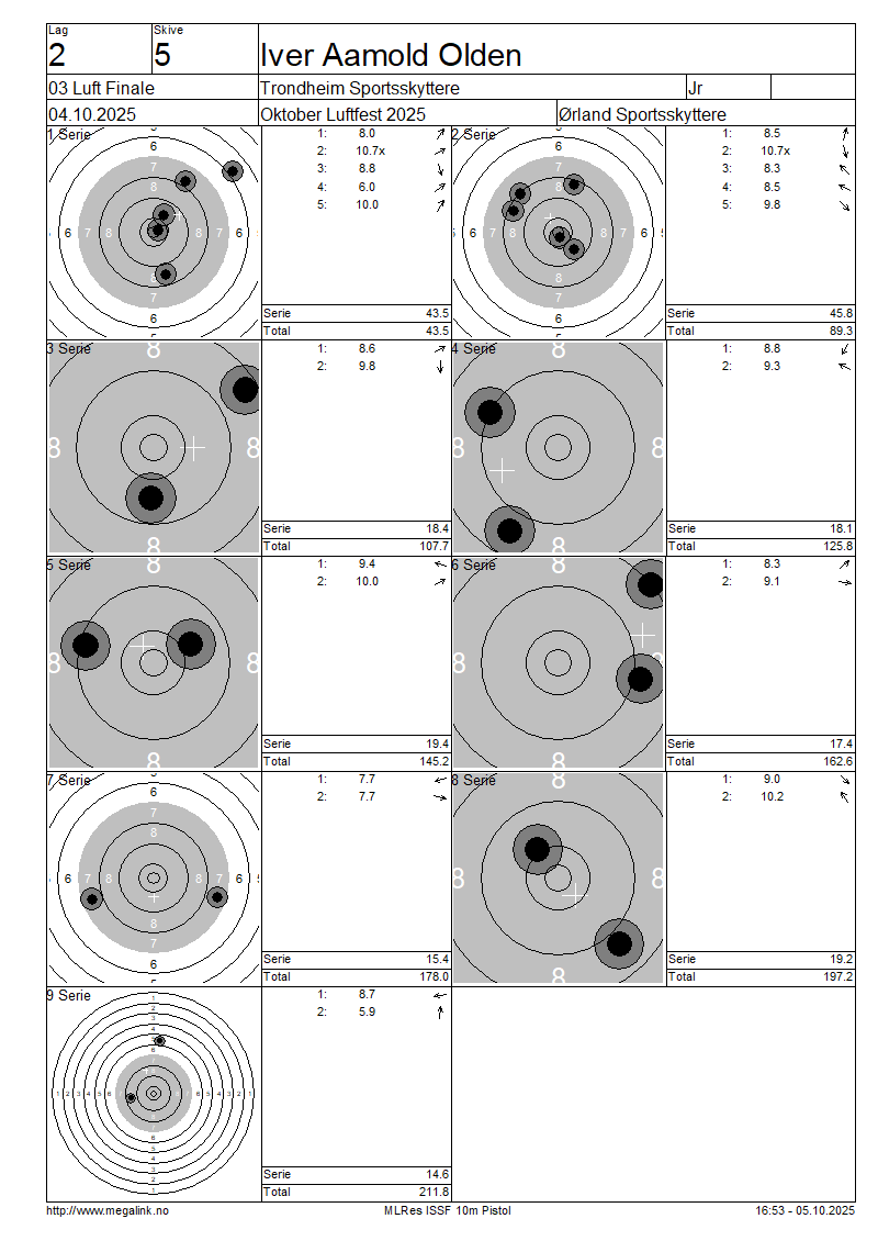 | E | 4 | OLDEN Iver Aamold | Trondheim Sportsskyttere | Jr | 43.5 | 45.8 | 18.4 | 18.1 | 19.4 | 17.4 | 15.4 | 19.2 | 14.6 | 211.8 | SO | ||||||||||||||||||||||||||||||||||