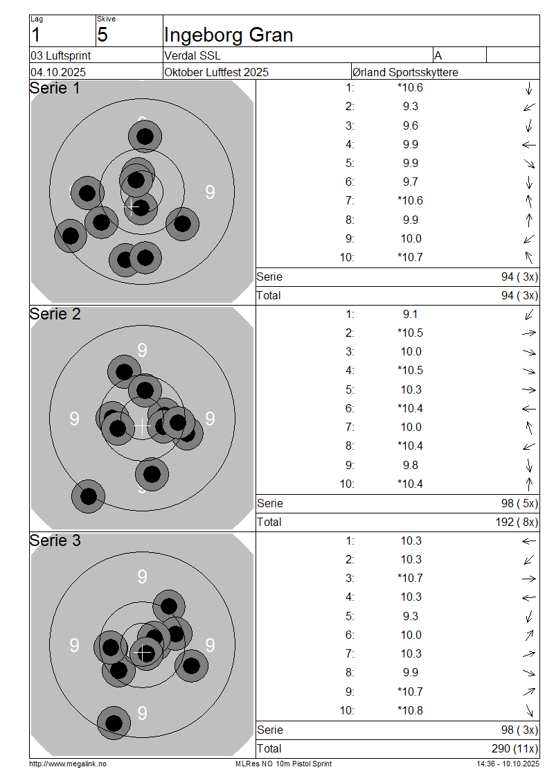 | 5 | 5 | GRAN Ingeborg | Verdal SSL | A | 94 | 98 | 98 | 290-11x | |||||||||||||||||||||||||||||||||||||||||