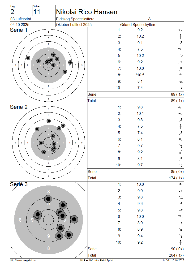 | 11 | 61 | HANSEN Nikolai Rico | Eidskog Sportsskyttere | A | 89 | 85 | 90 | 264- 1x | |||||||||||||||||||||||||||||||||||||||||