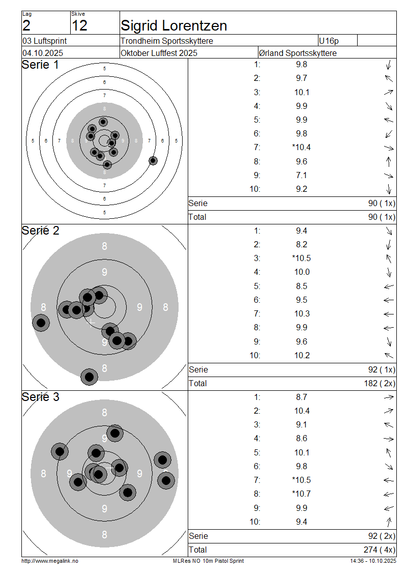 | 12 | 29 | LORENTZEN Sigrid | Trondheim Sportsskyttere | U16p | 90 | 92 | 92 | 274- 4x | |||||||||||||||||||||||||||||||||||||||||