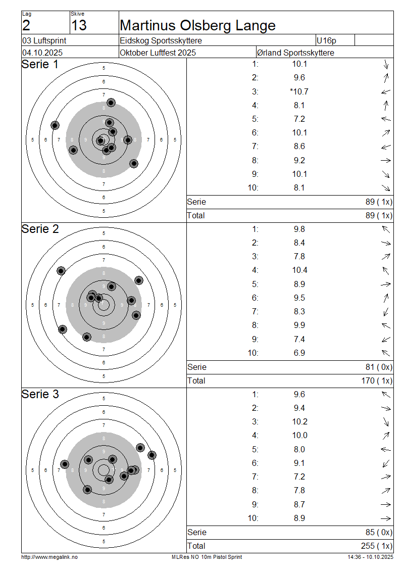 | 13 | 7 | LANGE Martinus Olsberg | Eidskog Sportsskyttere | U16p | 89 | 81 | 85 | 255- 1x | |||||||||||||||||||||||||||||||||||||||||