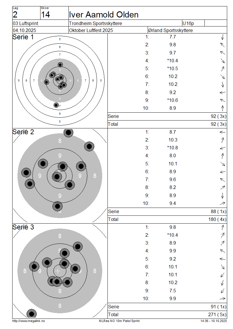 | 14 | 4 | OLDEN Iver Aamold | Trondheim Sportsskyttere | U16p | 92 | 88 | 91 | 271- 5x | |||||||||||||||||||||||||||||||||||||||||