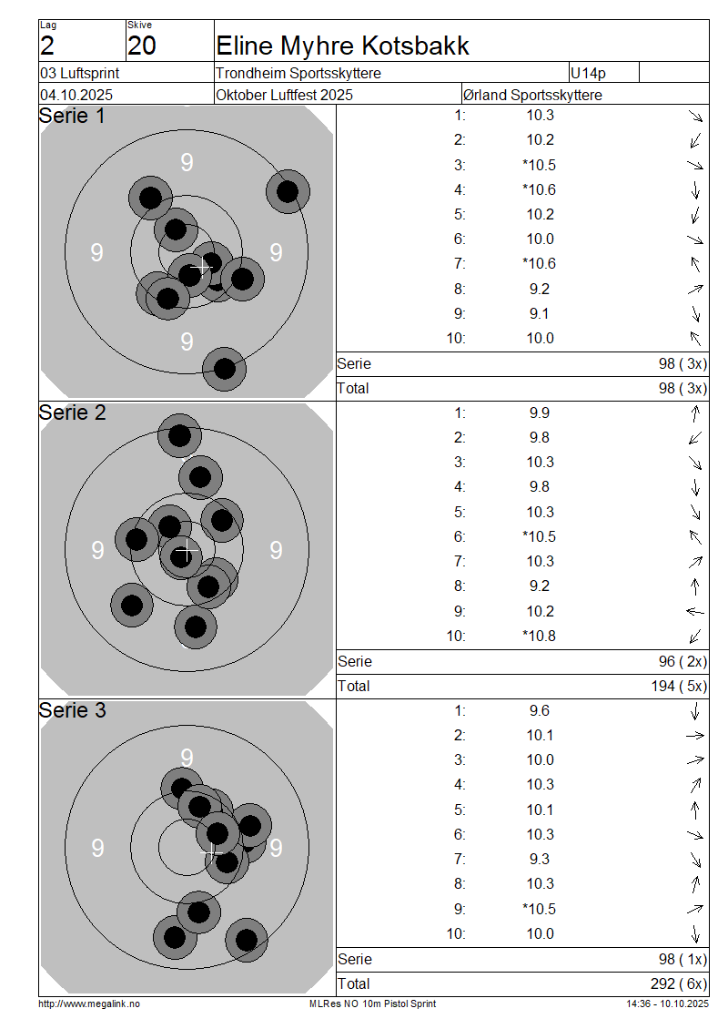 | 20 | 19 | KOTSBAKK Eline Myhre | Trondheim Sportsskyttere | U14p | 98 | 96 | 98 | 292- 6x | |||||||||||||||||||||||||||||||||||||||||