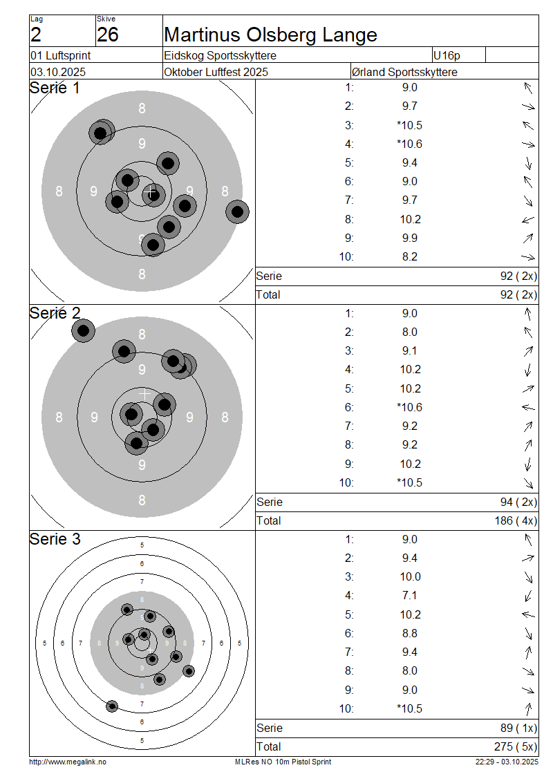 | 26 | 7 | LANGE Martinus Olsberg | Eidskog Sportsskyttere | U16p | 92 | 94 | 89 | 275- 5x | |||||||||||||||||||||||||||||||||||||||||
