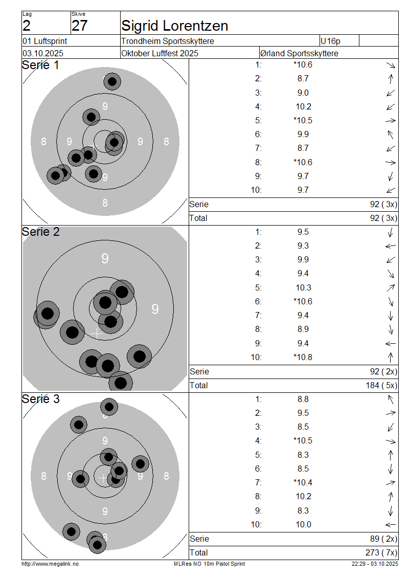 | 27 | 29 | LORENTZEN Sigrid | Trondheim Sportsskyttere | U16p | 92 | 92 | 89 | 273- 7x | |||||||||||||||||||||||||||||||||||||||||