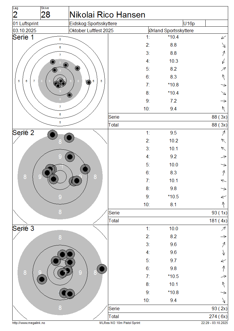 | 28 | 8 | RICO HANSEN Nikolai | Eidskog Sportsskyttere | U16p | 88 | 93 | 93 | 274- 6x | |||||||||||||||||||||||||||||||||||||||||