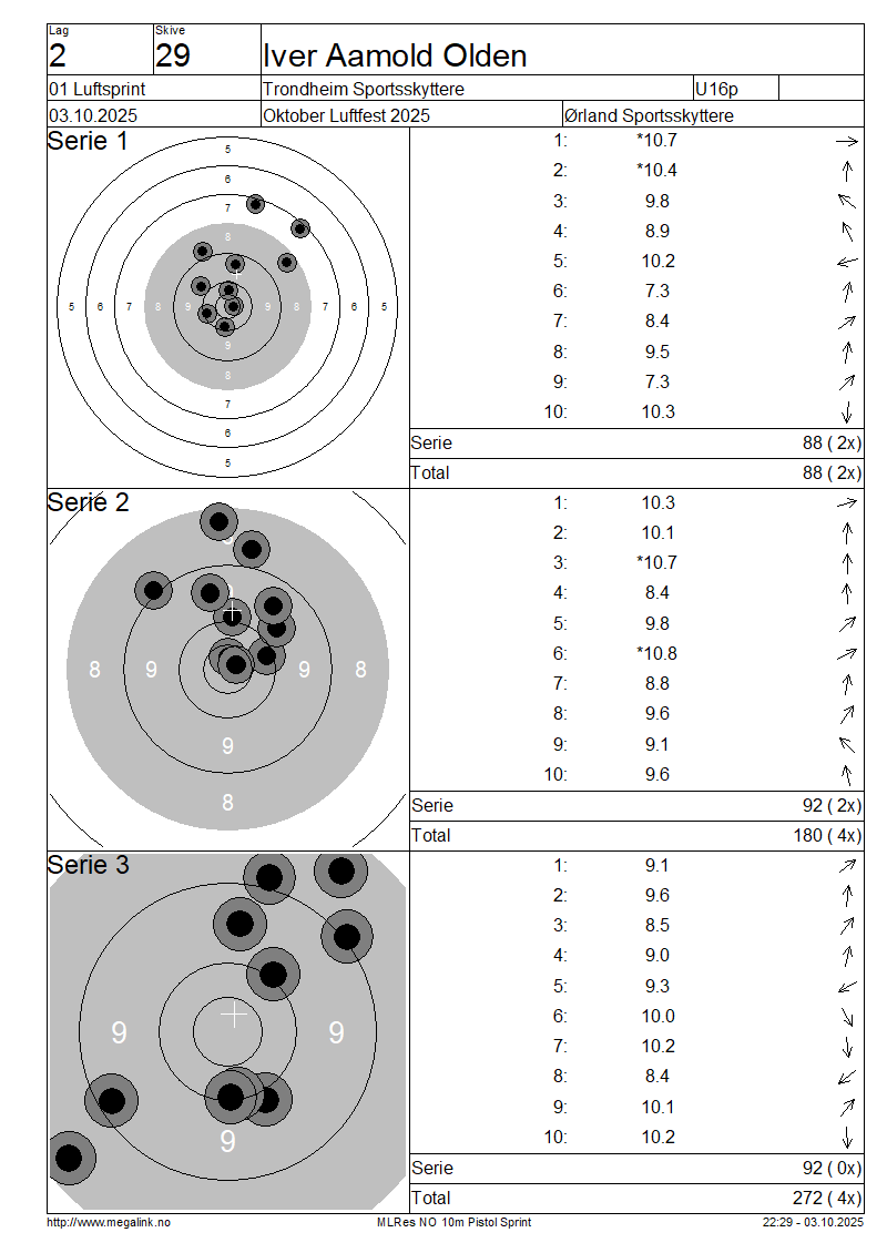 | 29 | 4 | OLDEN Iver Aamold | Trondheim Sportsskyttere | U16p | 88 | 92 | 92 | 272- 4x | |||||||||||||||||||||||||||||||||||||||||