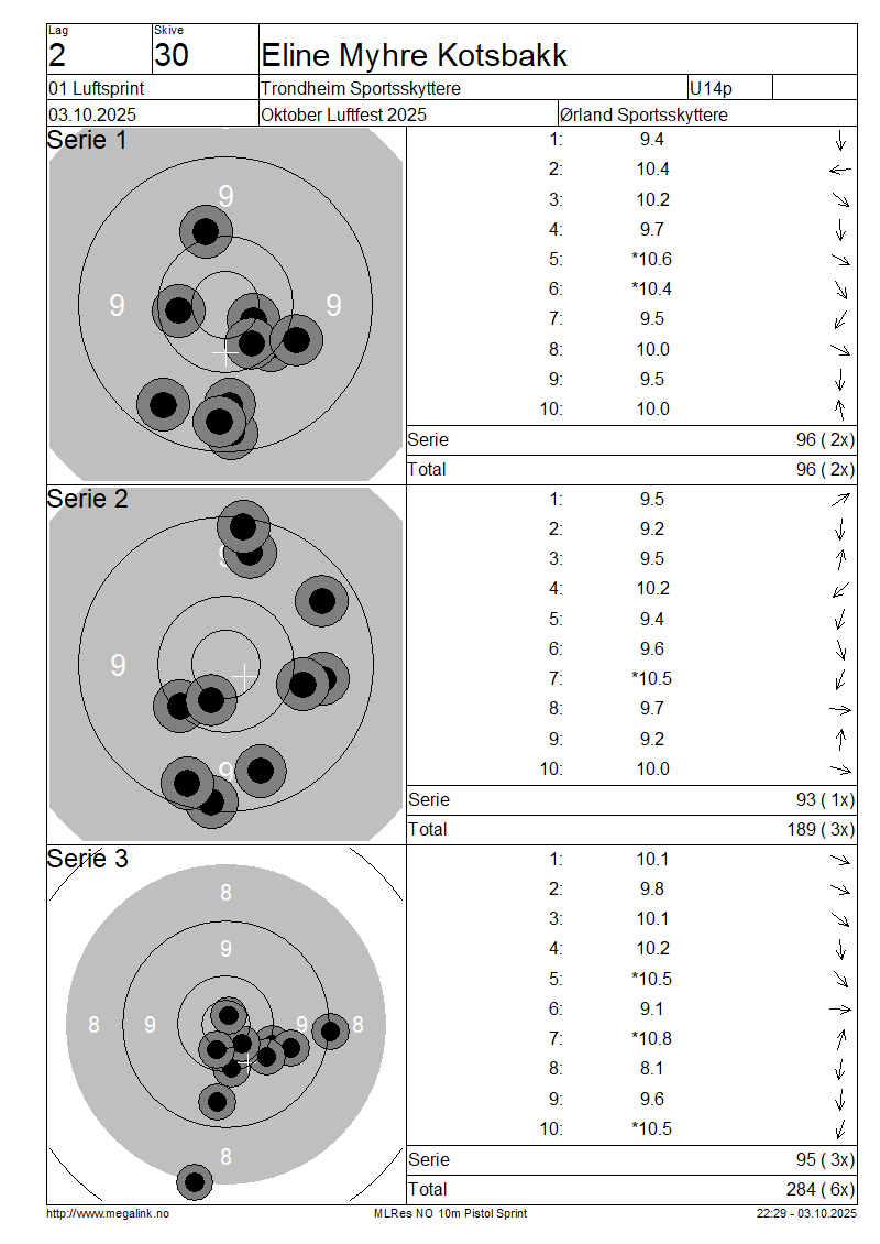 | 30 | 19 | KOTSBAKK Eline Myhre | Trondheim Sportsskyttere | U14p | 96 | 93 | 95 | 284- 6x | |||||||||||||||||||||||||||||||||||||||||