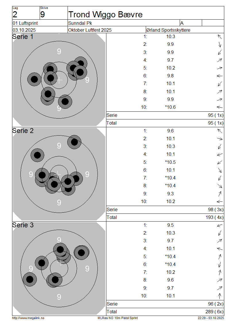 | 9 | 15 | BÆVRE Trond Wiggo | Sunndal Pk | A | 95 | 98 | 96 | 289- 6x | |||||||||||||||||||||||||||||||||||||||||