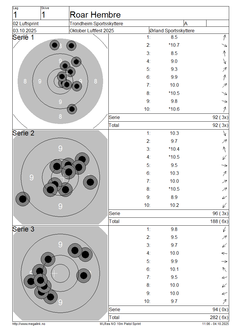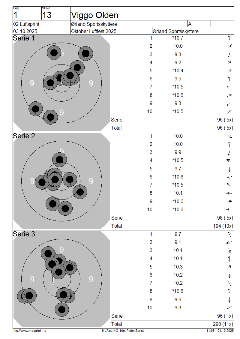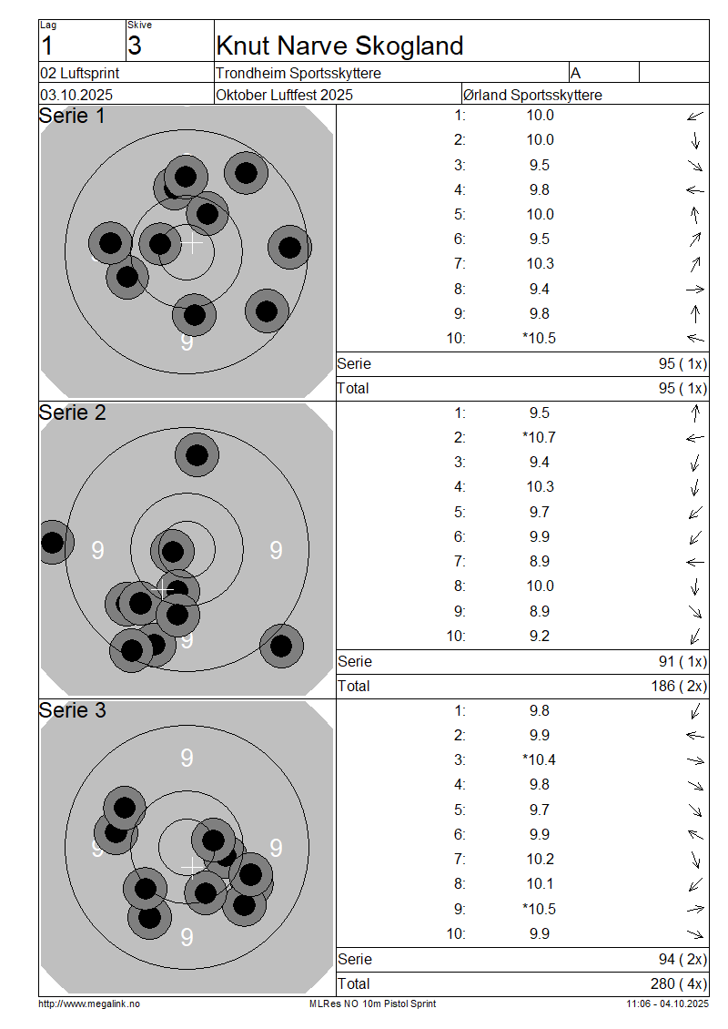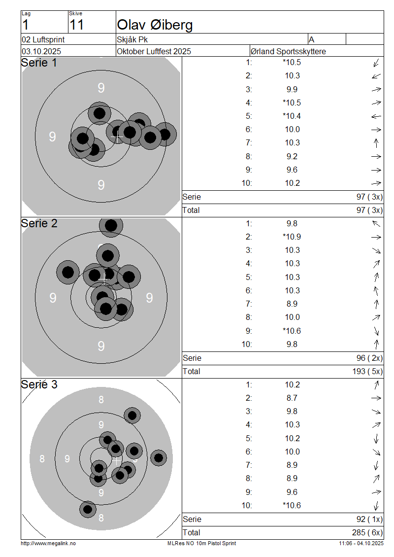 | 11 | 2 | ØIBERG Olav | Skjåk Pk | A | 97 | 96 | 92 | 285- 6x | |||||||||||||||||||||||||||||||||||||||||