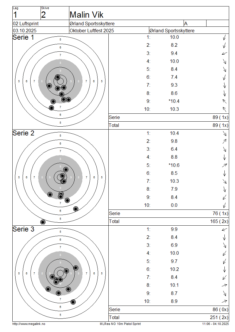 | 2 | 44 | VIK Malin | Ørland Sportsskyttere | A | 89 | 76 | 86 | 251- 2x | |||||||||||||||||||||||||||||||||||||||||
