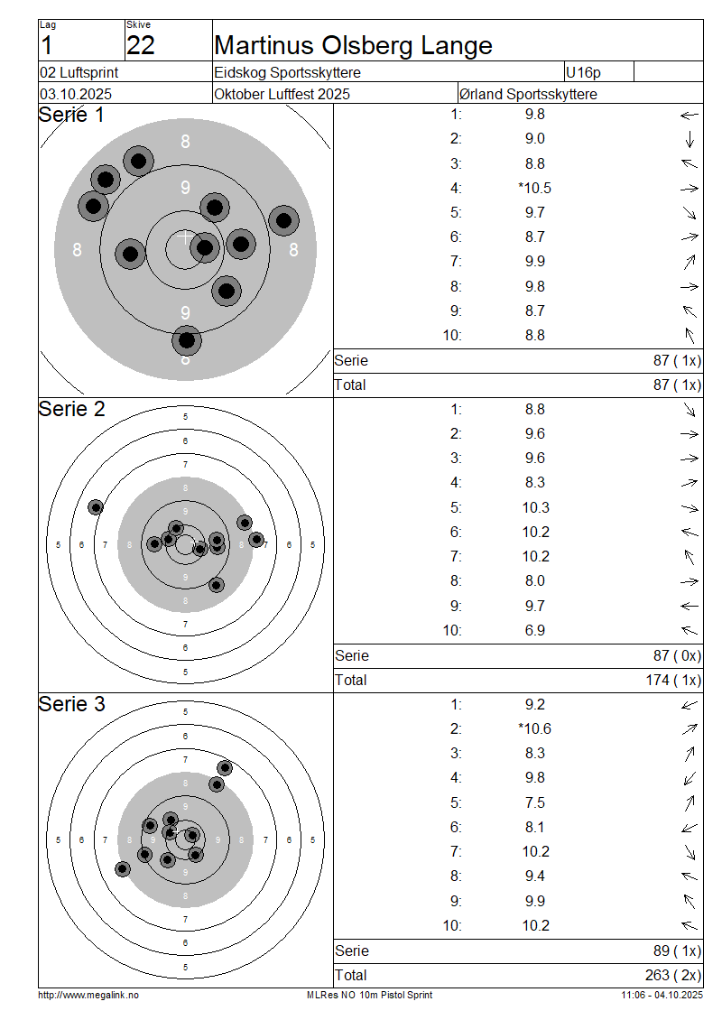 | 22 | 7 | LANGE Martinus Olsberg | Eidskog Sportsskyttere | U16p | 87 | 87 | 89 | 263- 2x | |||||||||||||||||||||||||||||||||||||||||