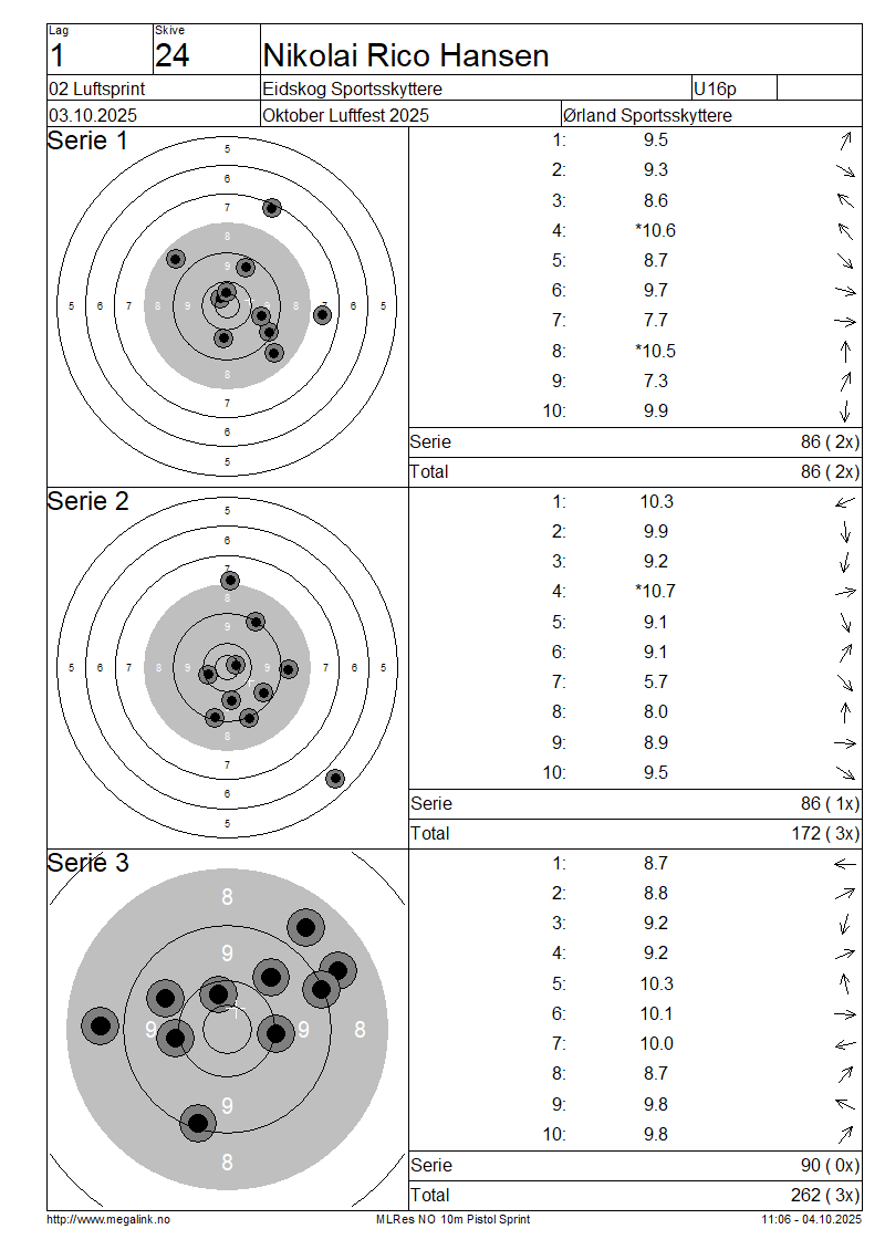 | 24 | 8 | RICO HANSEN Nikolai | Eidskog Sportsskyttere | U16p | 86 | 86 | 90 | 262- 3x | |||||||||||||||||||||||||||||||||||||||||
