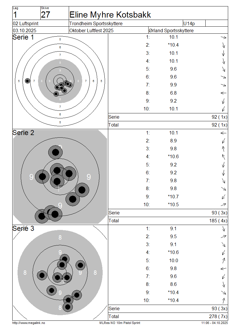 | 27 | 19 | KOTSBAKK Eline Myhre | Trondheim Sportsskyttere | U14p | 92 | 93 | 93 | 278- 7x | |||||||||||||||||||||||||||||||||||||||||