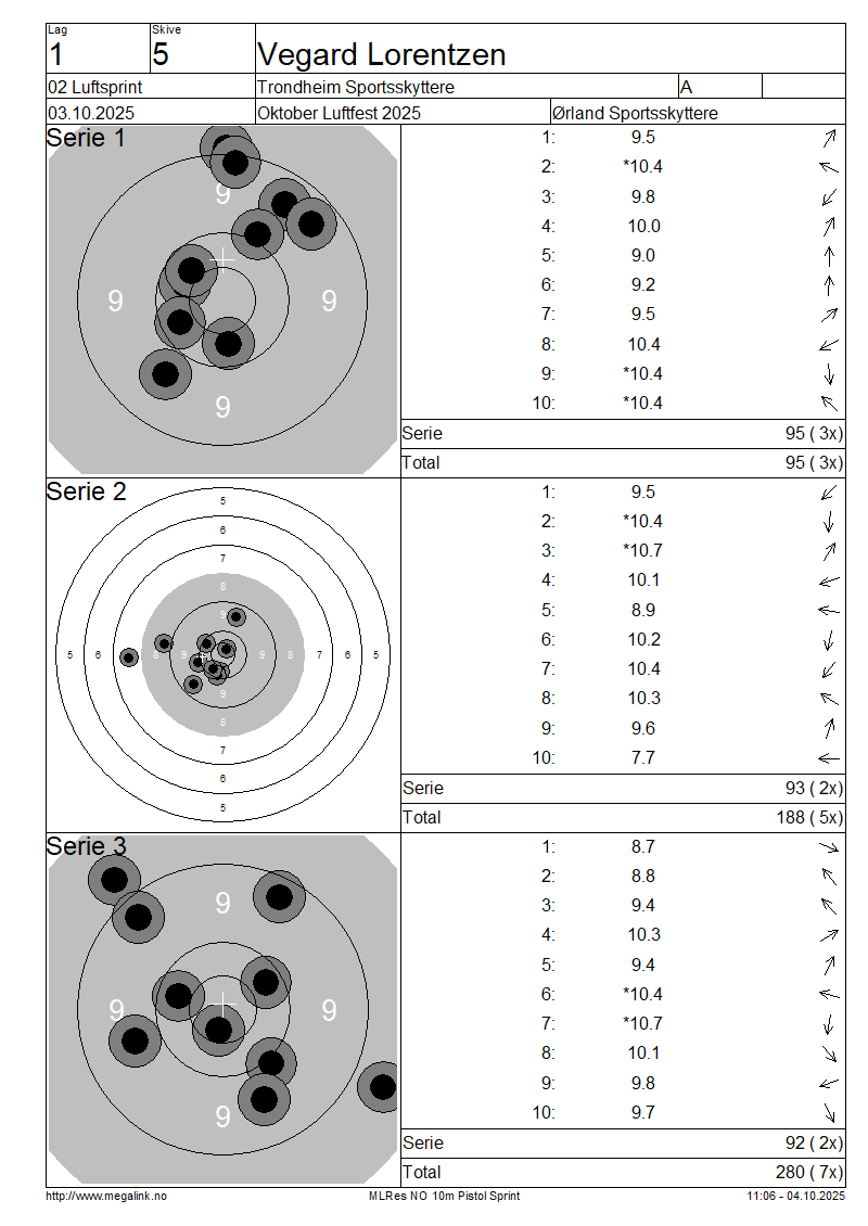 | 5 | 30 | LORENTZEN Vegard | Trondheim Sportsskyttere | A | 95 | 93 | 92 | 280- 7x | |||||||||||||||||||||||||||||||||||||||||